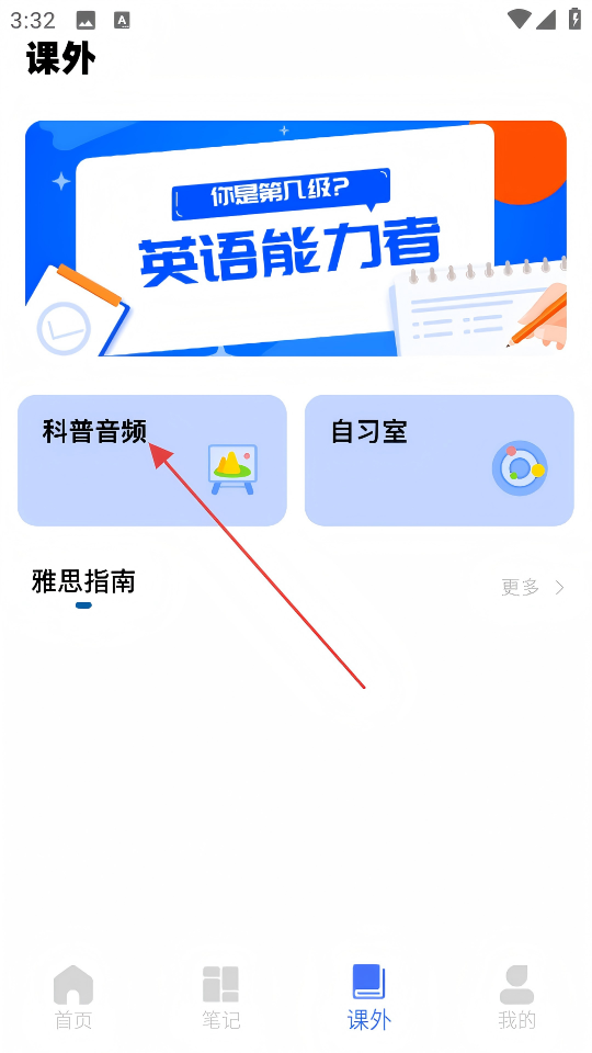 2、在课外学习页面点击【科普音频】,进入听科普列表页面。