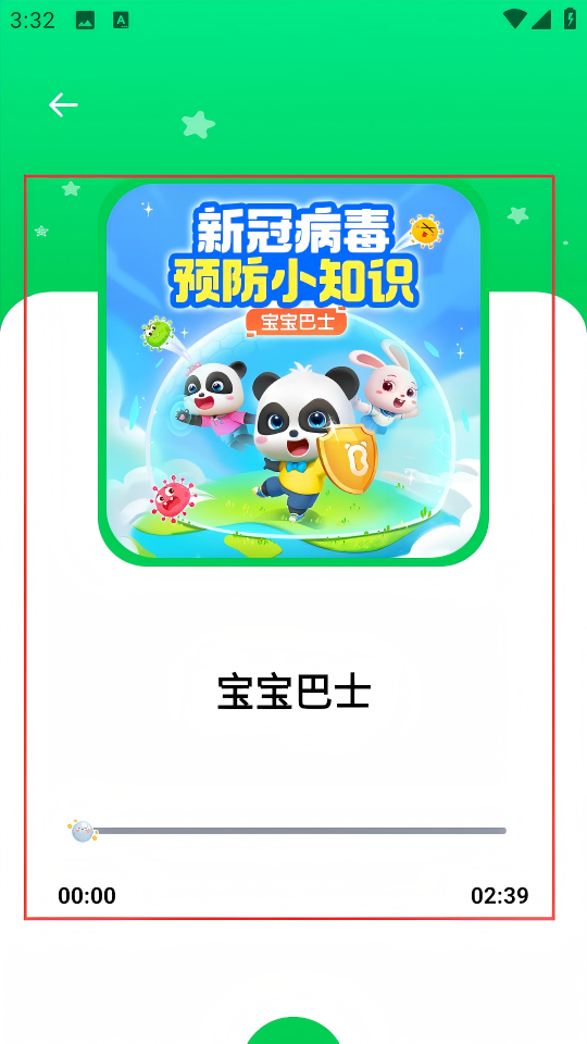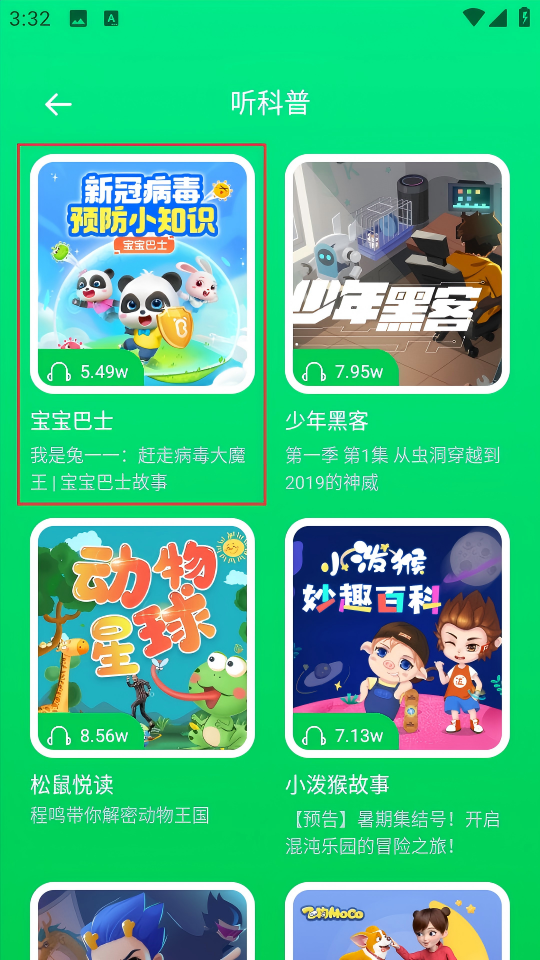 3、在听科普列表中选择【宝宝巴士】音频,进入音频播放页面。
