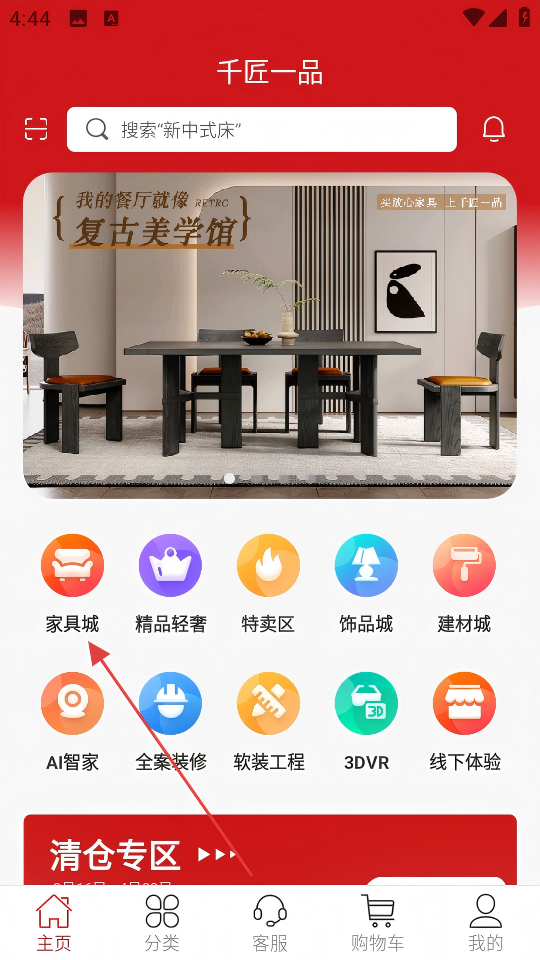 1、在千匠一品首页点击【家具城】,进入家具分类页面。