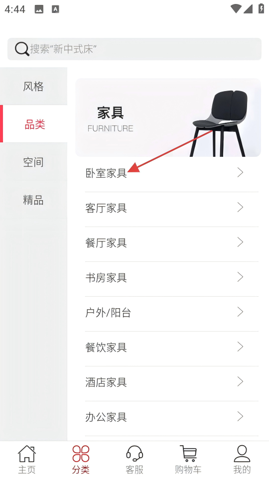 2、在家具分类页面的【品类】中选择【卧室家具】,进入卧室家具商品列表页面。