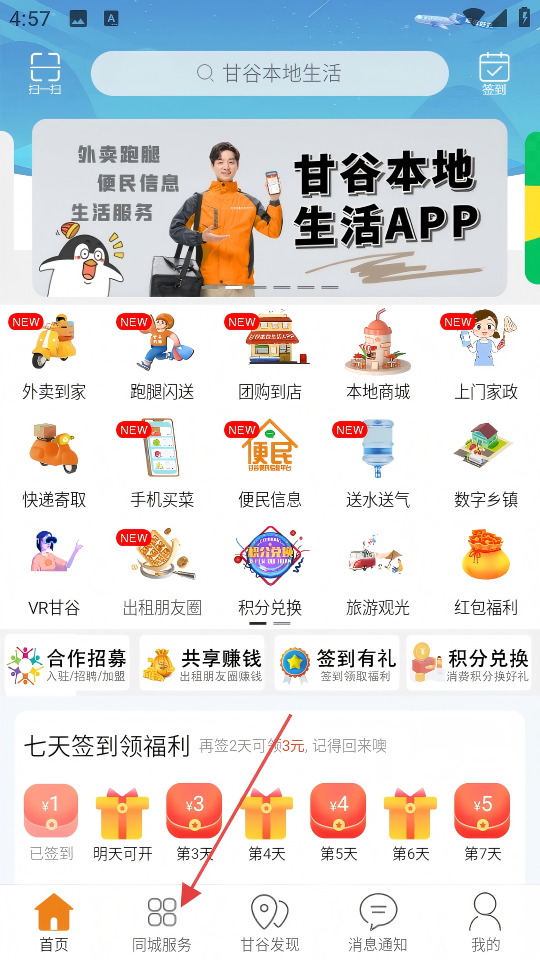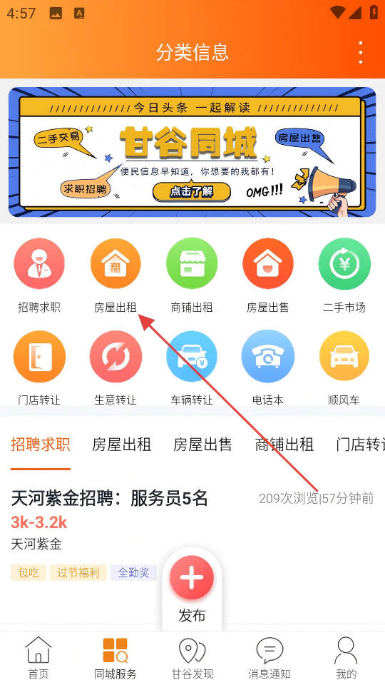 1、在甘谷本地生活APP首页点击【同城服务】,进入分类信息页面。