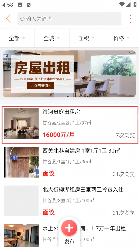 3、在房屋出租列表中选择【滨河豪庭出租房】,进入该房源详情页面。