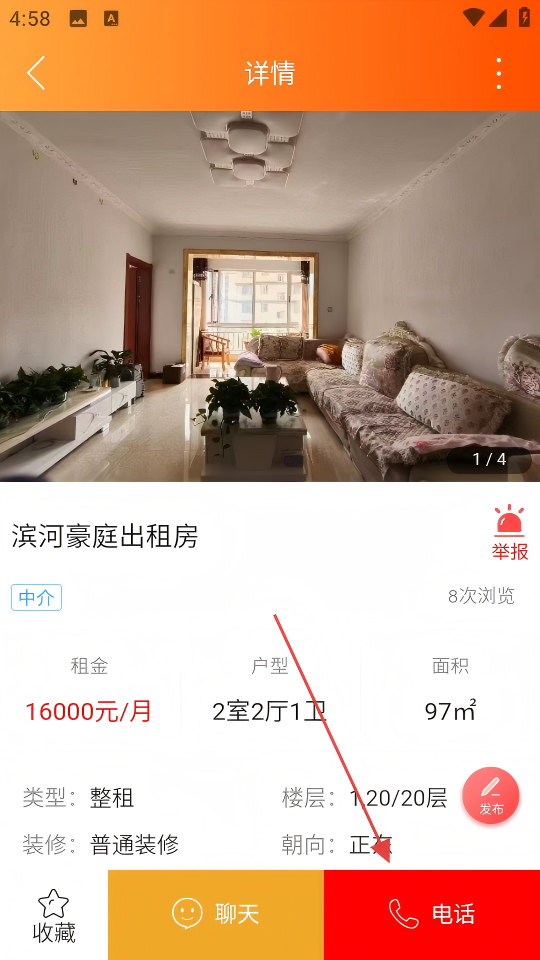 4、在房源详情页面可点击【电话】联系房东,以便进一步了解或租赁该房源。