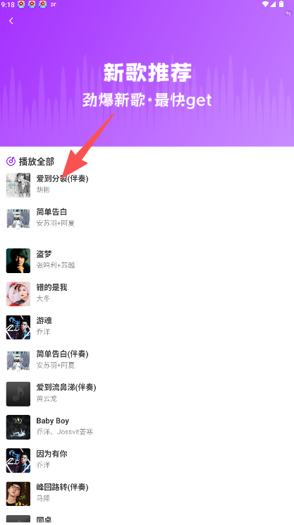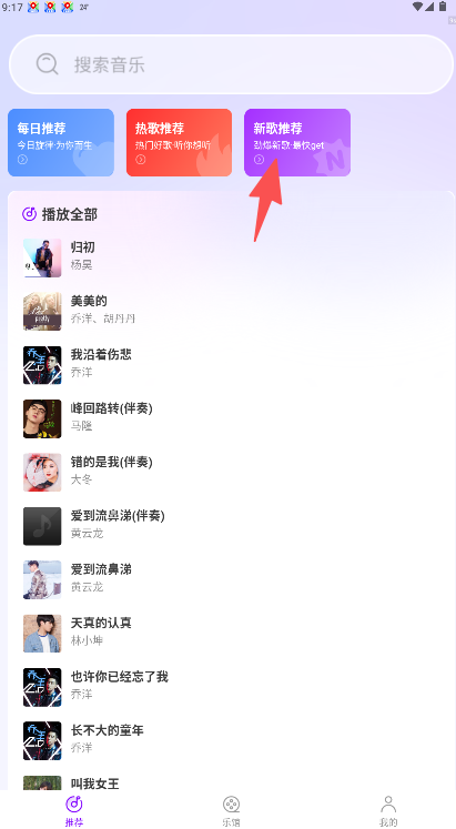 1、在“新歌推荐”标签页浏览歌曲列表进入。
