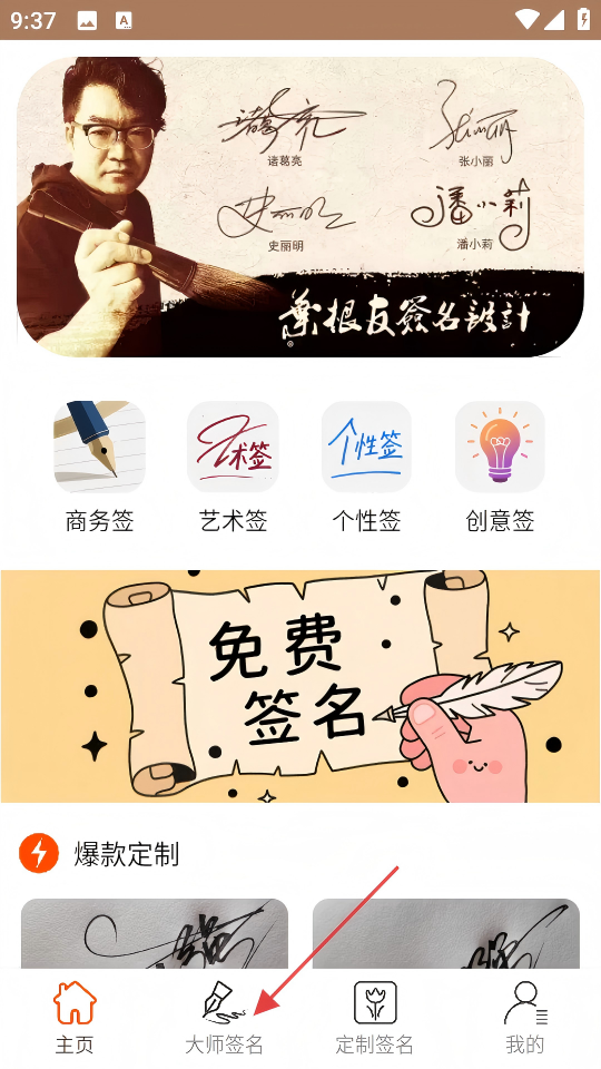 2、在主界面点击底部【大师签名】按钮,进入大师签名页面。