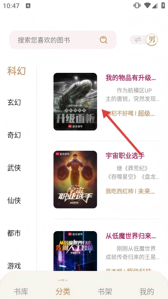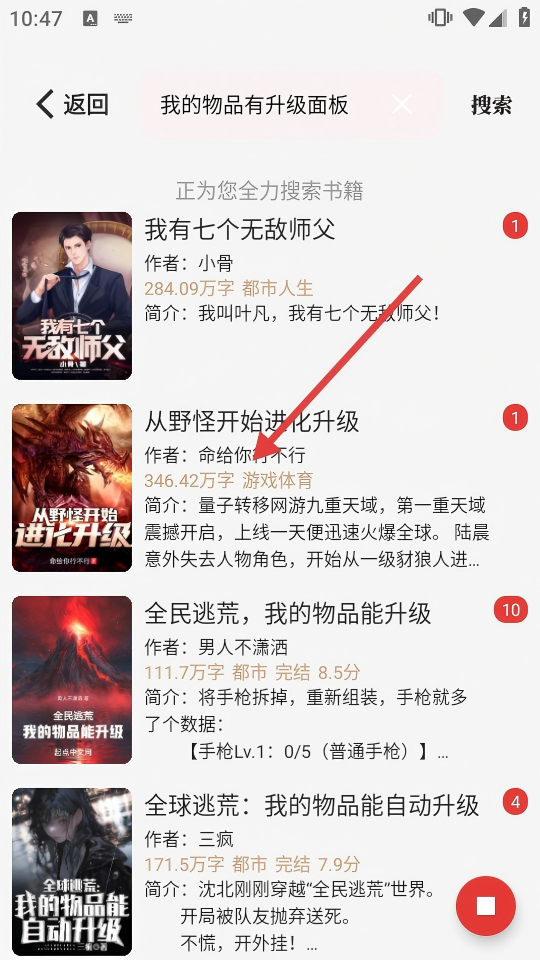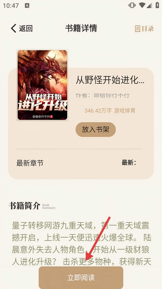 2、在分类页找到目标小说【从野怪开始进化升级】,点击进入书籍详情页。