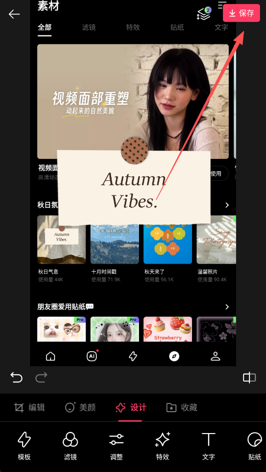 4、在素材应用页面,点击【保存】,即可完成素材使用保存操作。
