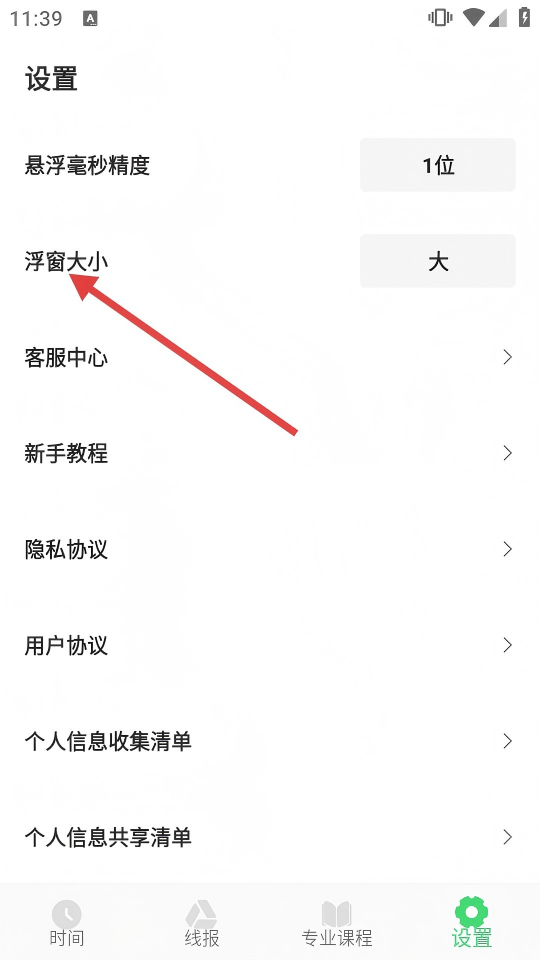 3、在设置页面点击【浮窗大小】,进入浮窗大小选择页。