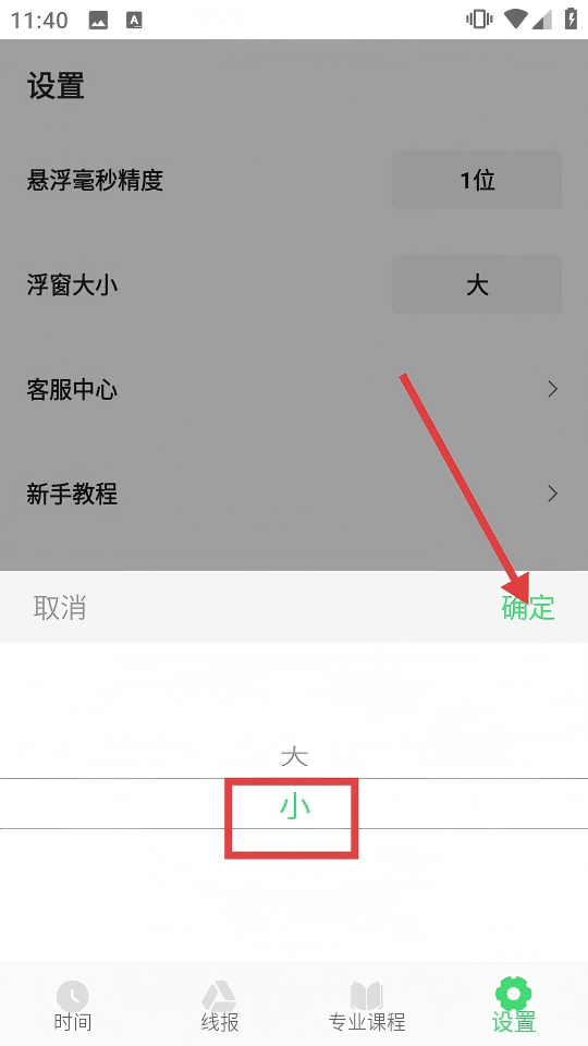 4、选择【小】后点击【确定】,完成浮窗大小的设置操作。