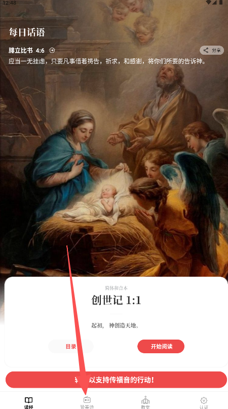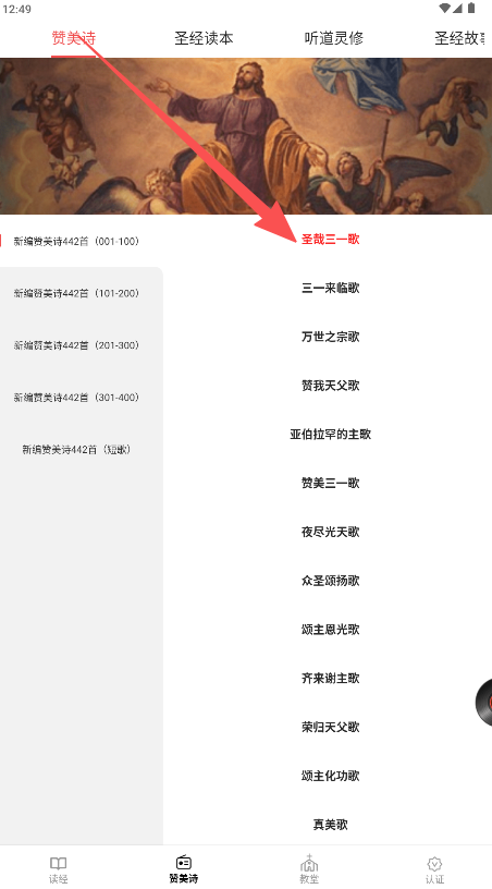2、在赞美诗栏目中选择歌曲,例如“圣哉三一歌”。