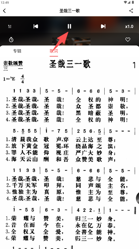 3、进入歌曲可查看完整歌词与乐谱,上方配有播放控制,便于跟随学唱或默想。