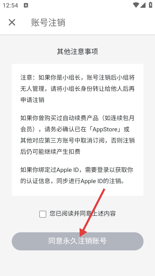4、在账号注销页面勾选“您已阅读并同意上述内容”后,点击【同意永久注销账号】按钮,即可完成账号永久注销操作。