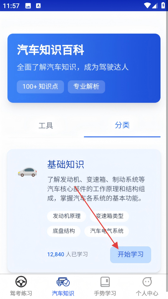 2、在汽车知识页面的基础知识板块点击【开始学习】。