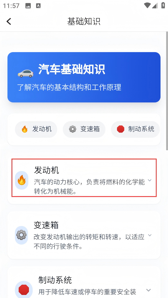 3、在基础知识详情页面点击【发动机】选项。