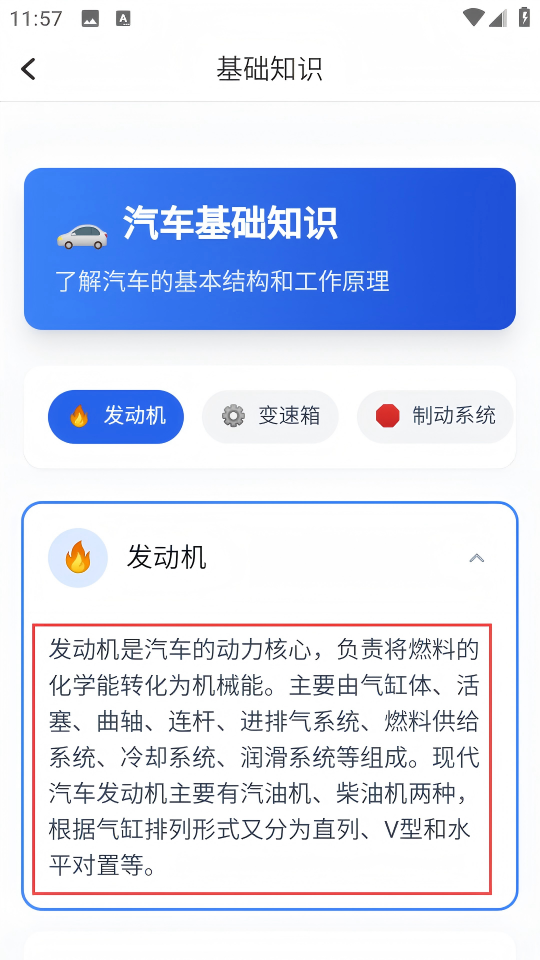 4、展开查看发动机的详细介绍,包括其作为汽车动力核心的功能、组成结构及类型等内容。