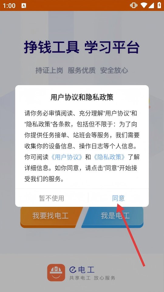 1、在用户协议和隐私政策弹窗中点击【同意】,进入应用主界面。