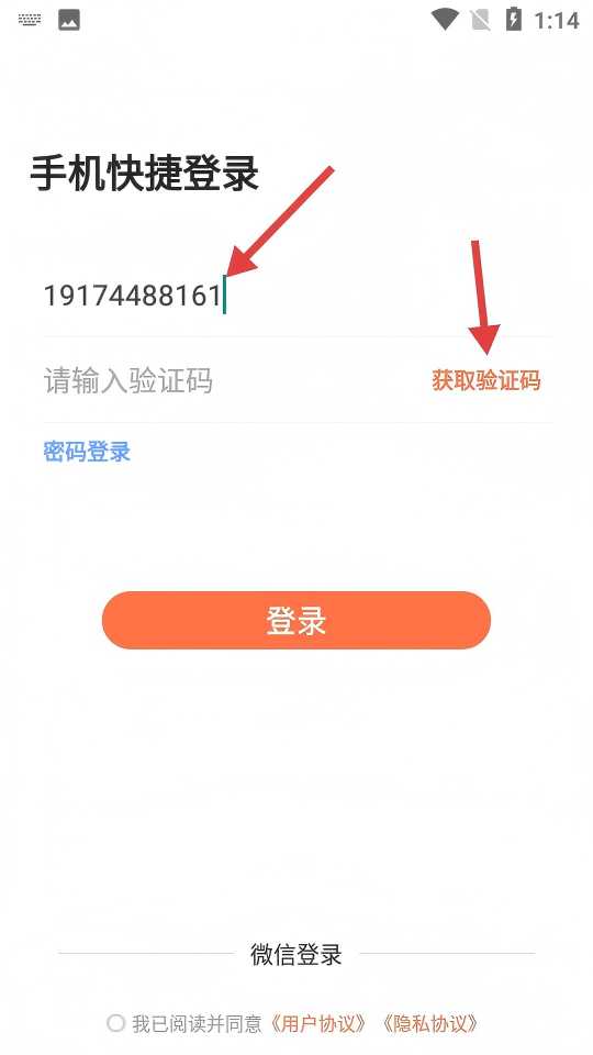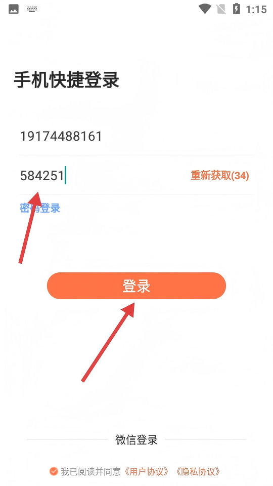 4、输入收到的短信验证码,勾选同意《用户协议》《隐私协议》后点击【登录】,完成应用的登录操作。