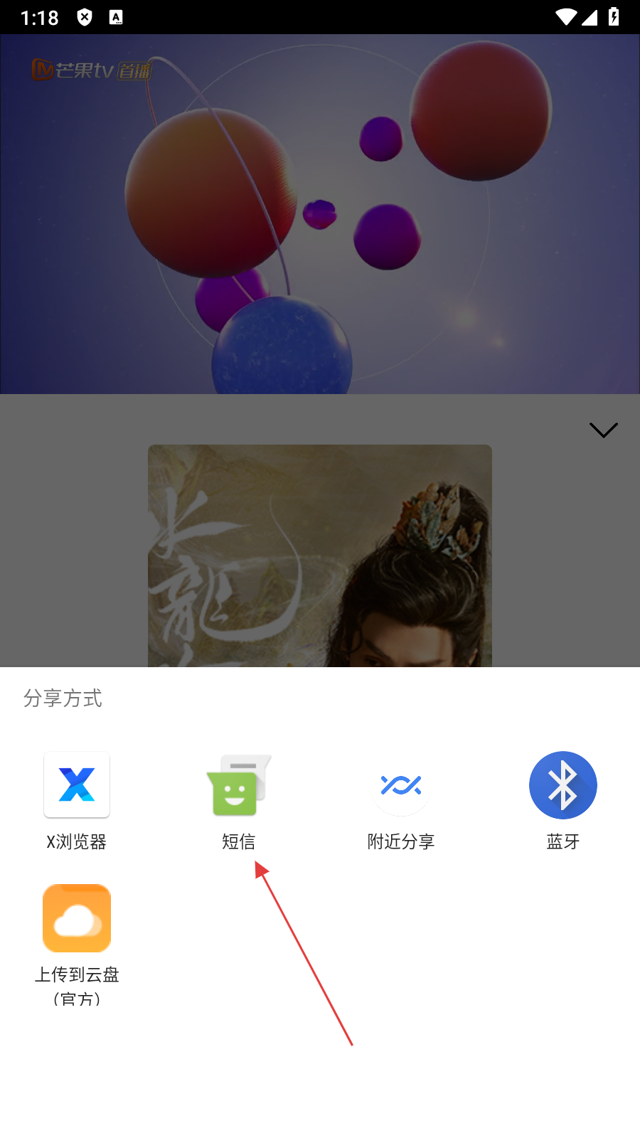 4、在分享方式选择页面,点击【短信】,完成视频分享操作。