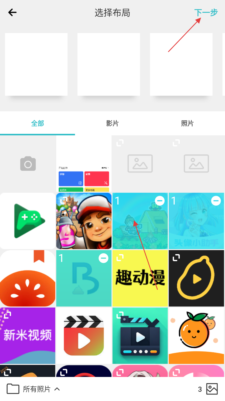 2、在选择布局页面【选择图片】后,点击【下一步】,进入图片拼接编辑页面。