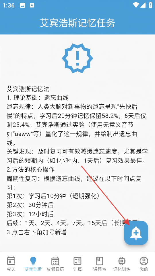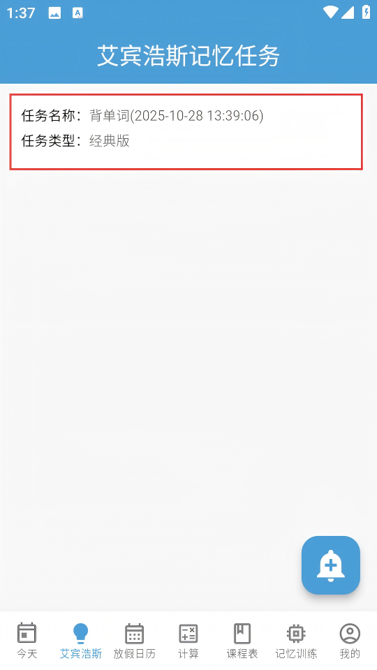 2、在艾宾浩斯记忆任务页面点击右下角加号按钮,进入新增艾宾浩斯记忆任务页面。
