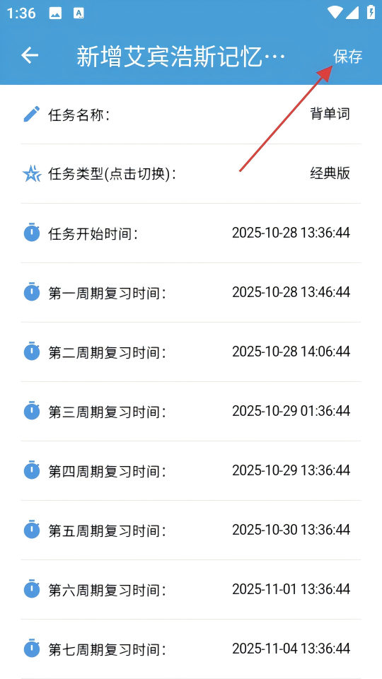 3、在新增页面填写完成后,点击【保存】按钮,即可创建艾宾浩斯记忆任务。