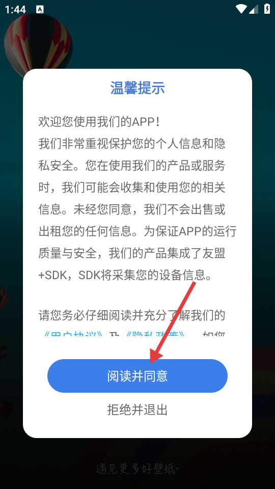 1、点击【阅读并同意】按钮,同意隐私相关提示,进入APP主界面。