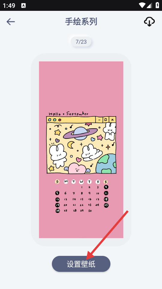 3、在手绘系列壁纸列表页面点击喜欢的壁纸(如粉色日历风格壁纸),进入该壁纸的详情页面。