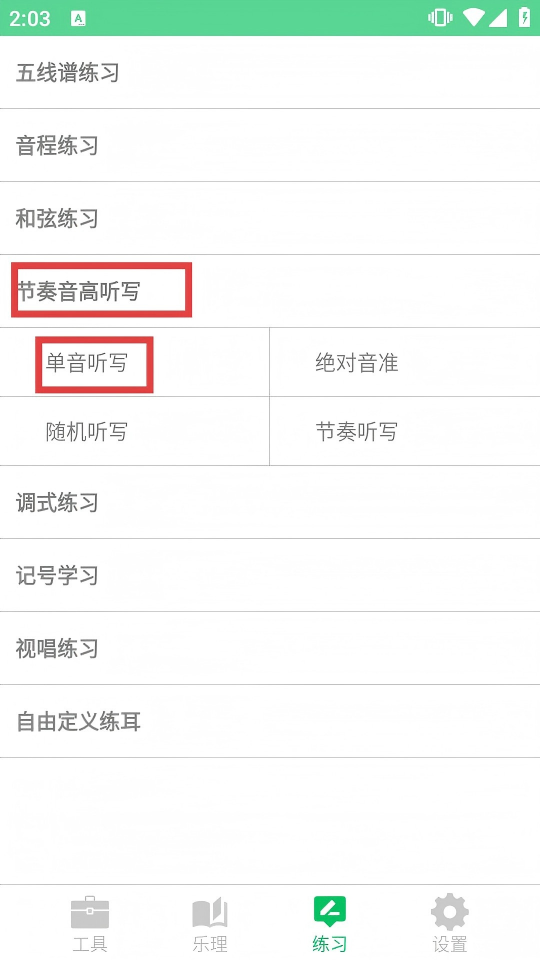 2、在练习页面选择【节奏音高听写】下的【单音听写】,进入单音听写练习页面。