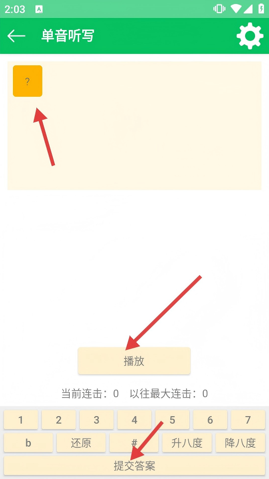 3、在单音听写页面点击【播放】按钮听音频,根据听到的单音在下方键盘选择答案后点击【提交答案】。
