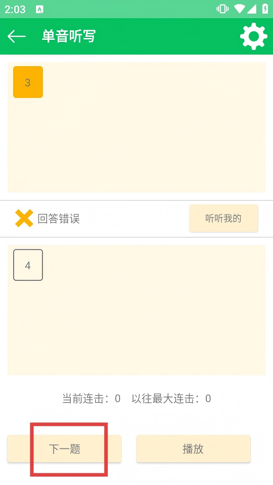 4、若回答错误,点击【下一题】继续进行单音听写练习。