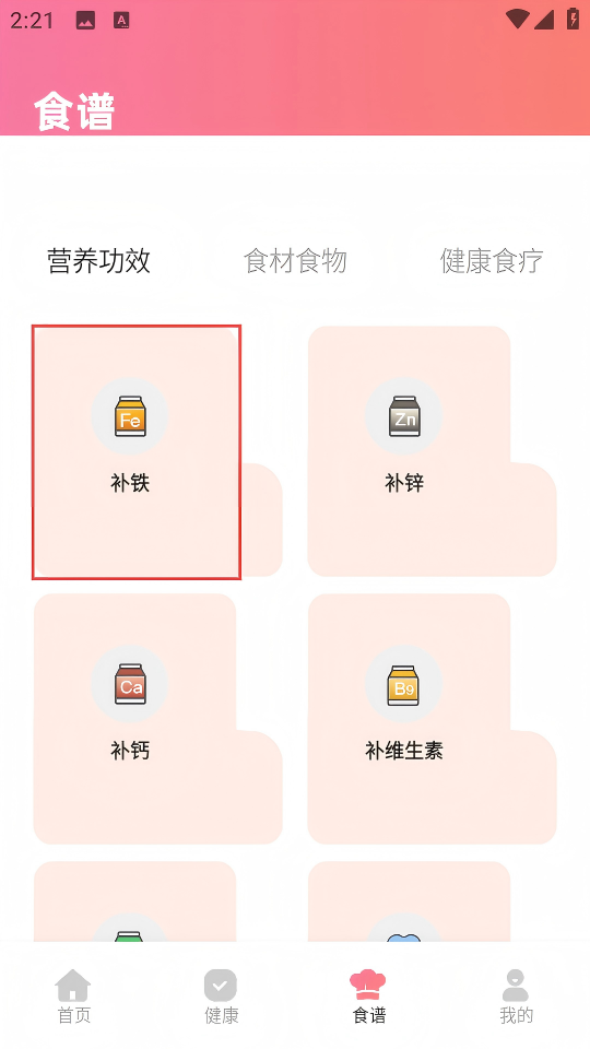 2、在食谱页面的营养功效分类下点击【补铁】,进入补铁食谱列表页面。