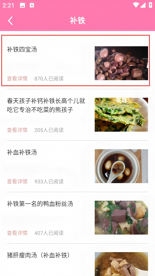 3、在补铁食谱列表页面点击【补铁四宝汤】,进入该食谱的详情页面。