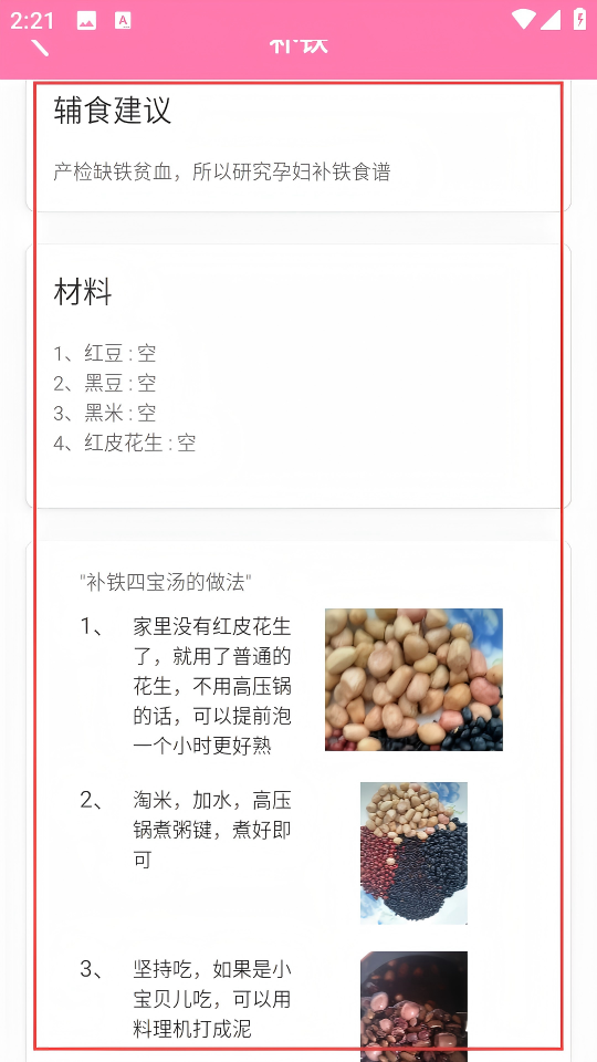 4、在详情页面可查看辅食建议、材料及做法,学习补铁食谱制作,满足补铁营养需求。