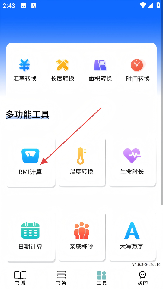 2、在工具页面的多功能工具板块点击【BMI计算】,进入BMI计算页面。