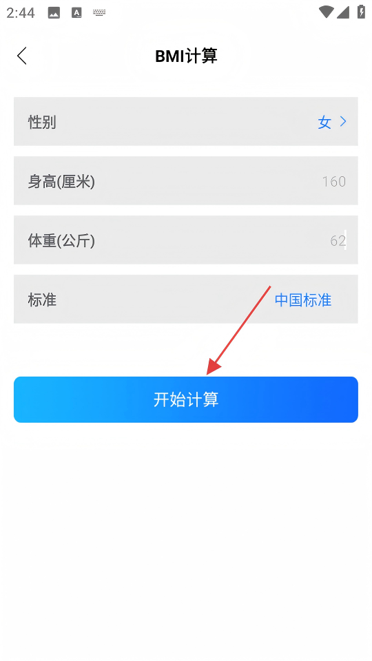 3、在BMI计算页面填写性别、身高、体重等信息后,点击【开始计算】按钮。