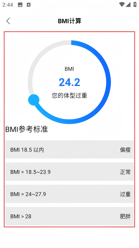 4、计算完成后,可查看BMI数值、体型判断及BMI参考标准。