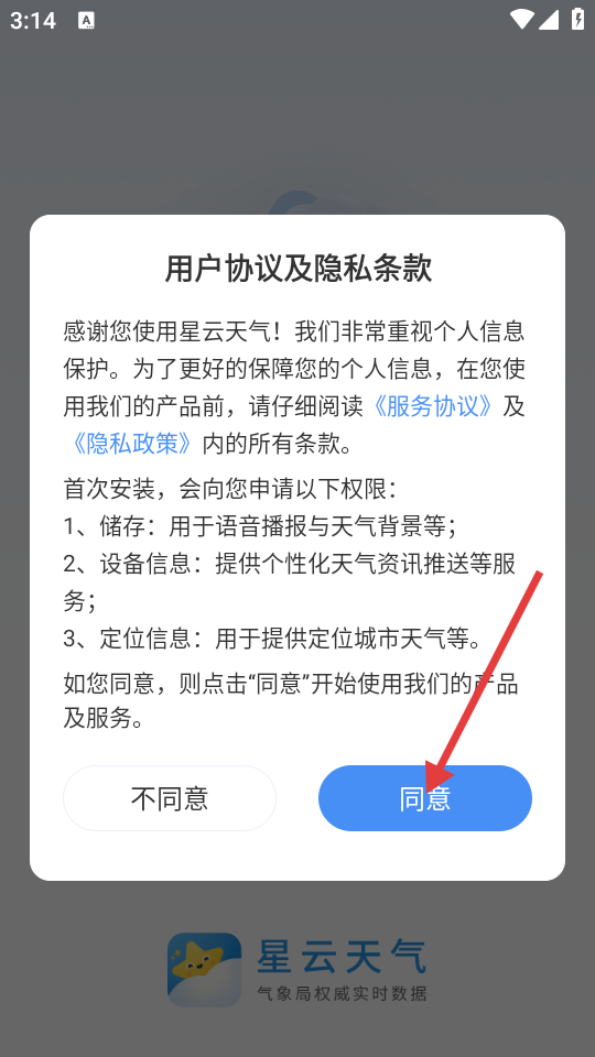 1、点击【同意】按钮,同意用户协议及隐私条款,进入主界面。