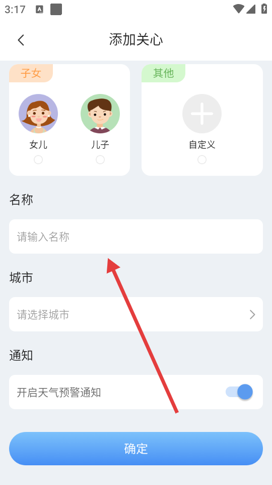 4、在添加关心页面选择分类、输入名称、选择城市并设置天气预警通知后,点击【确定】,即可添加关心信息。