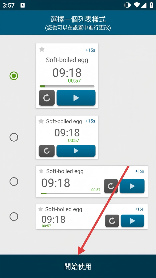 1、选择列表样式后点击【开始使用】,进入应用主界面,可查看茶、溏心蛋等预设计时器。