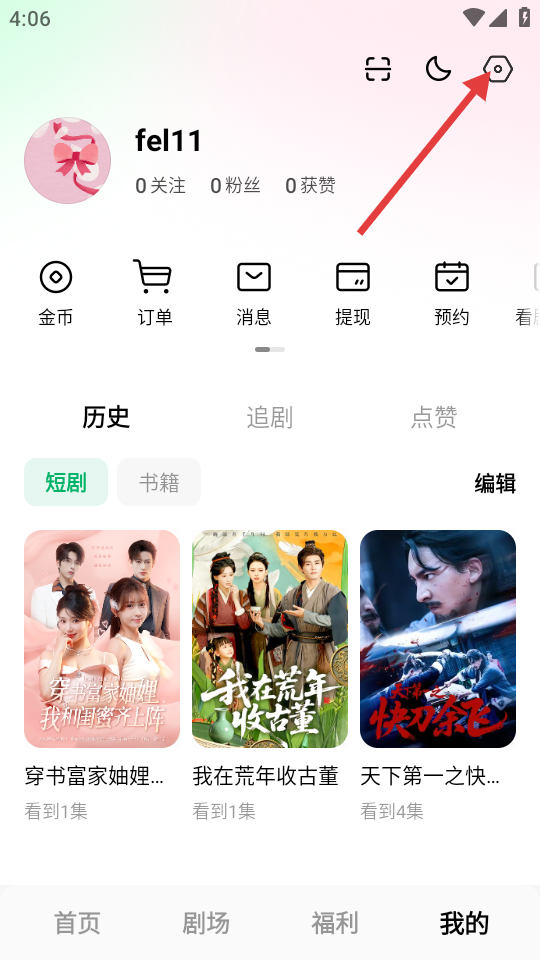 1、在“我的”页面中,点击右上角设置图标,进入设置页面。