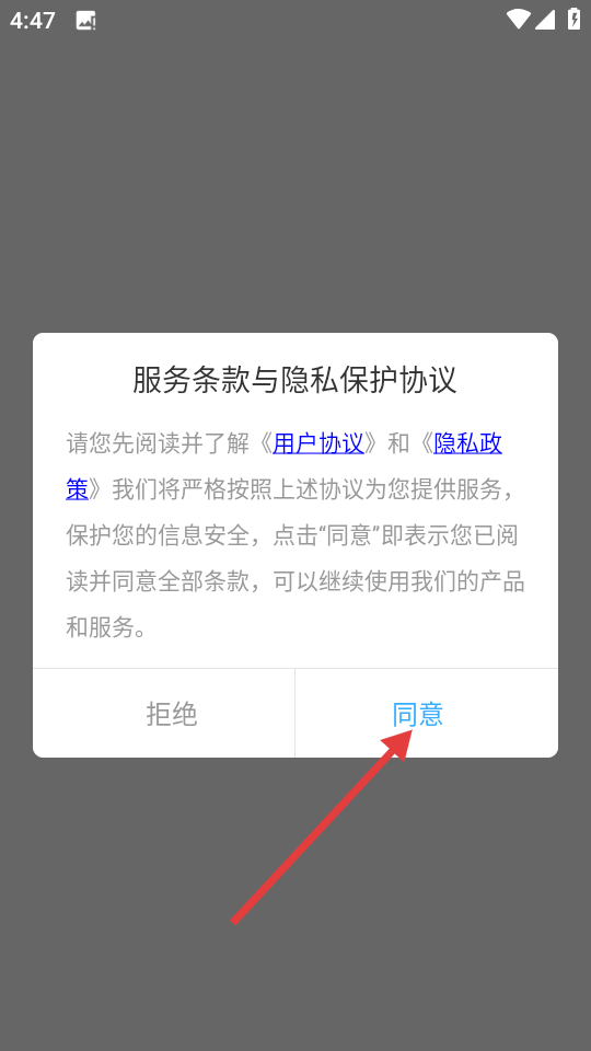 1、点击【同意】按钮,同意服务条款与隐私保护协议,进入主界面。