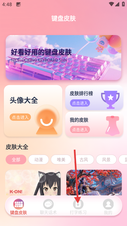 1、提供丰富多样的键盘皮肤资源库,涵盖多种流行风格与主题类型,支持实时预览与一键切换应用功能。