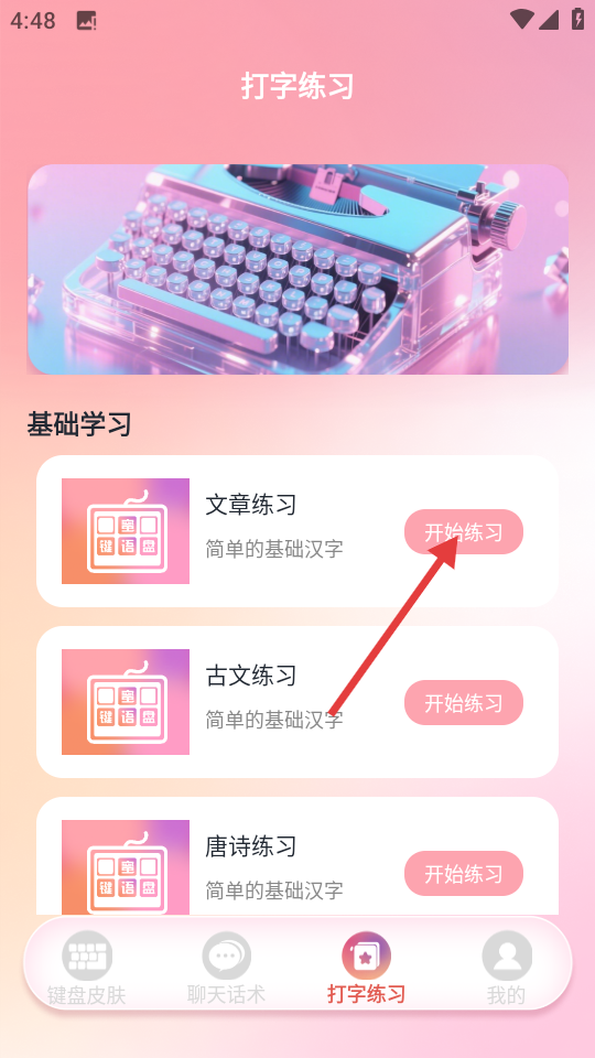2、在主界面,点击底部【打字练习】选项,进入打字练习页面。