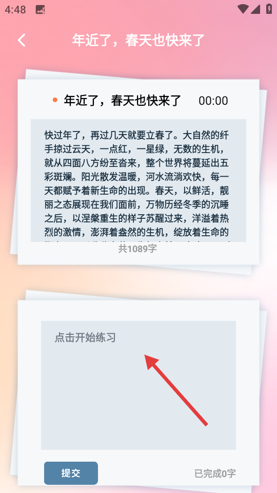 4、在练习内容页面,点击“点击开始练习”区域,即可开始进行打字练习,提升打字速度和准确性。