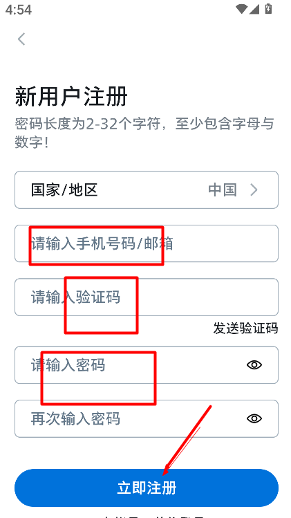 3、随后输入手机号码或邮箱地址,填写收到的验证码并设置登录密码,确认无误后再次点击“立即注册”即可完成账号创建。
