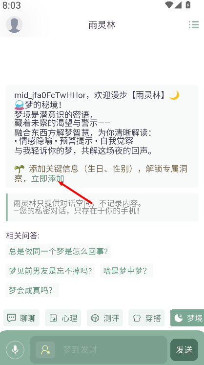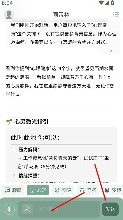 2、在“心灵微光指引”板块中,可输入关键词发送消息,系统会根据主题呈现文字或语音形式的心灵指引内容。