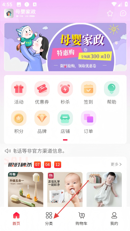 1、进入【母婴家政】首页后,点击底部【分类】按钮。