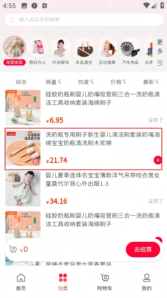 2、支持将需购买的母婴商品添加到购物车,集中管理商品数量,可一键全选下单,避免重复操作,简化多商品采购流程。