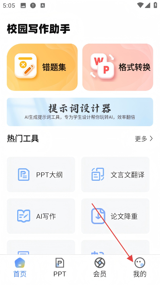 1、进入【校园写作助手】首页后,点击底部【我的】按钮,进入个人页面。