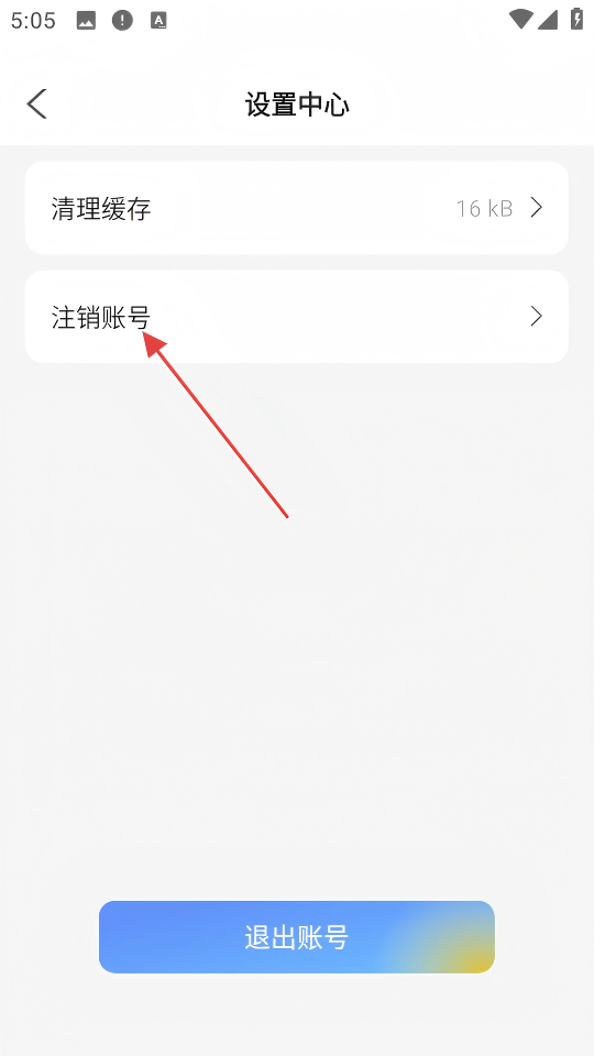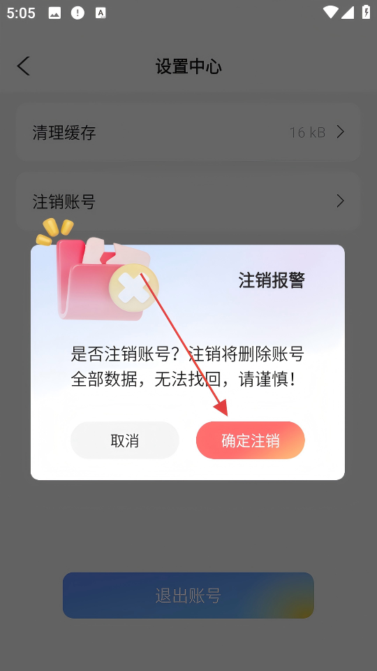 3、在【设置中心】页面,点击【注销账号】选项,触发注销确认弹窗。